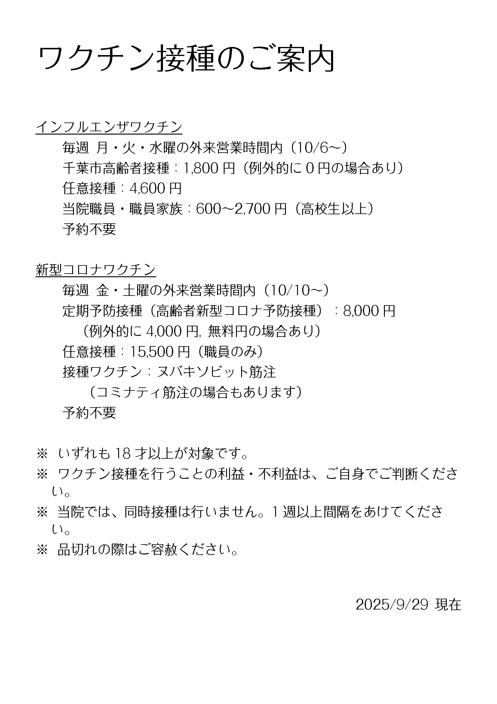 2026年1月末日をもって、千葉市の新型コロナワクチン定期接種助成事業が終了となったため、現在新型コロナワクチンの接種は行っていません。