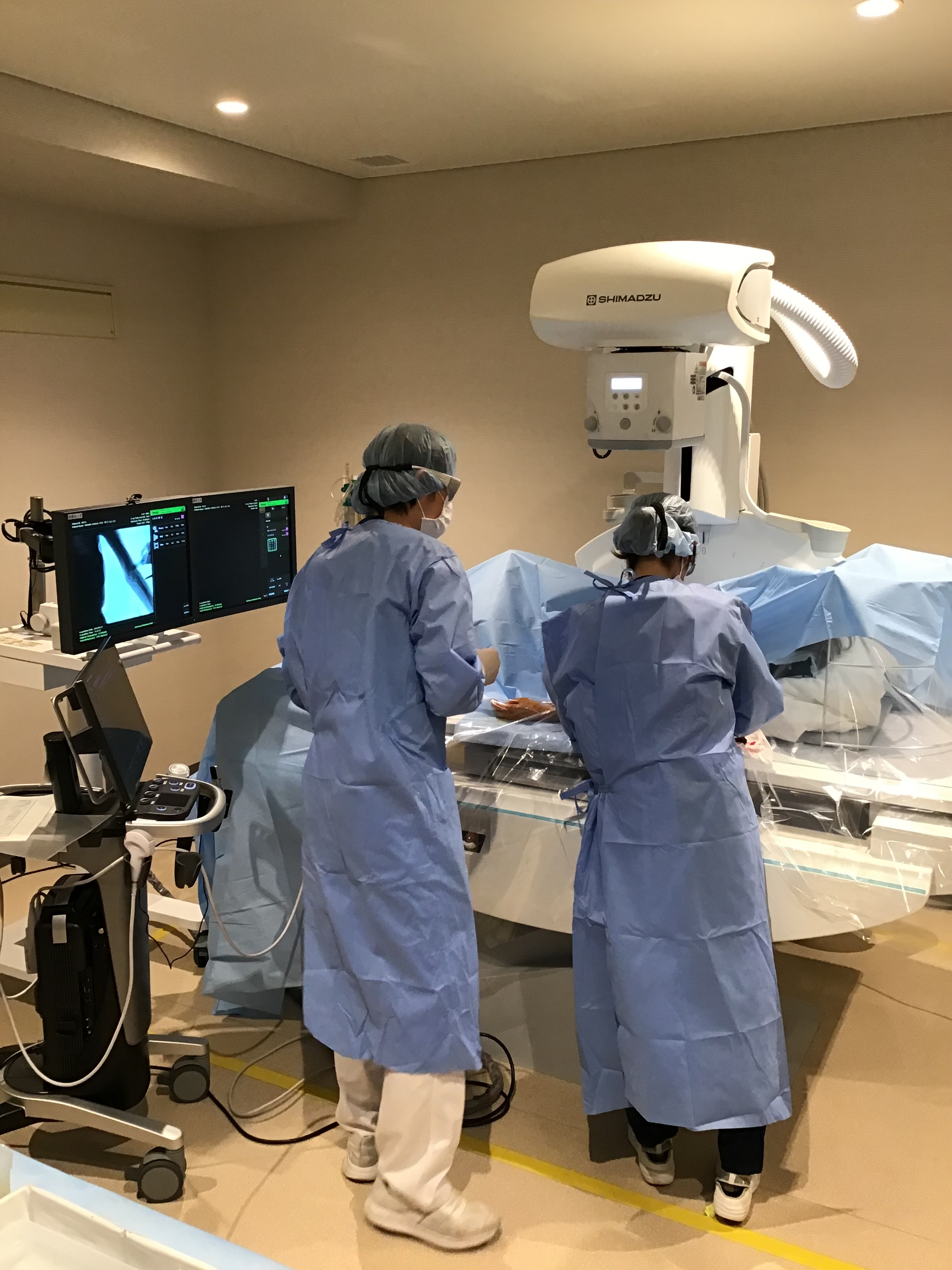 経皮的血管拡張術等の補助として透視室や手術室に入ります。