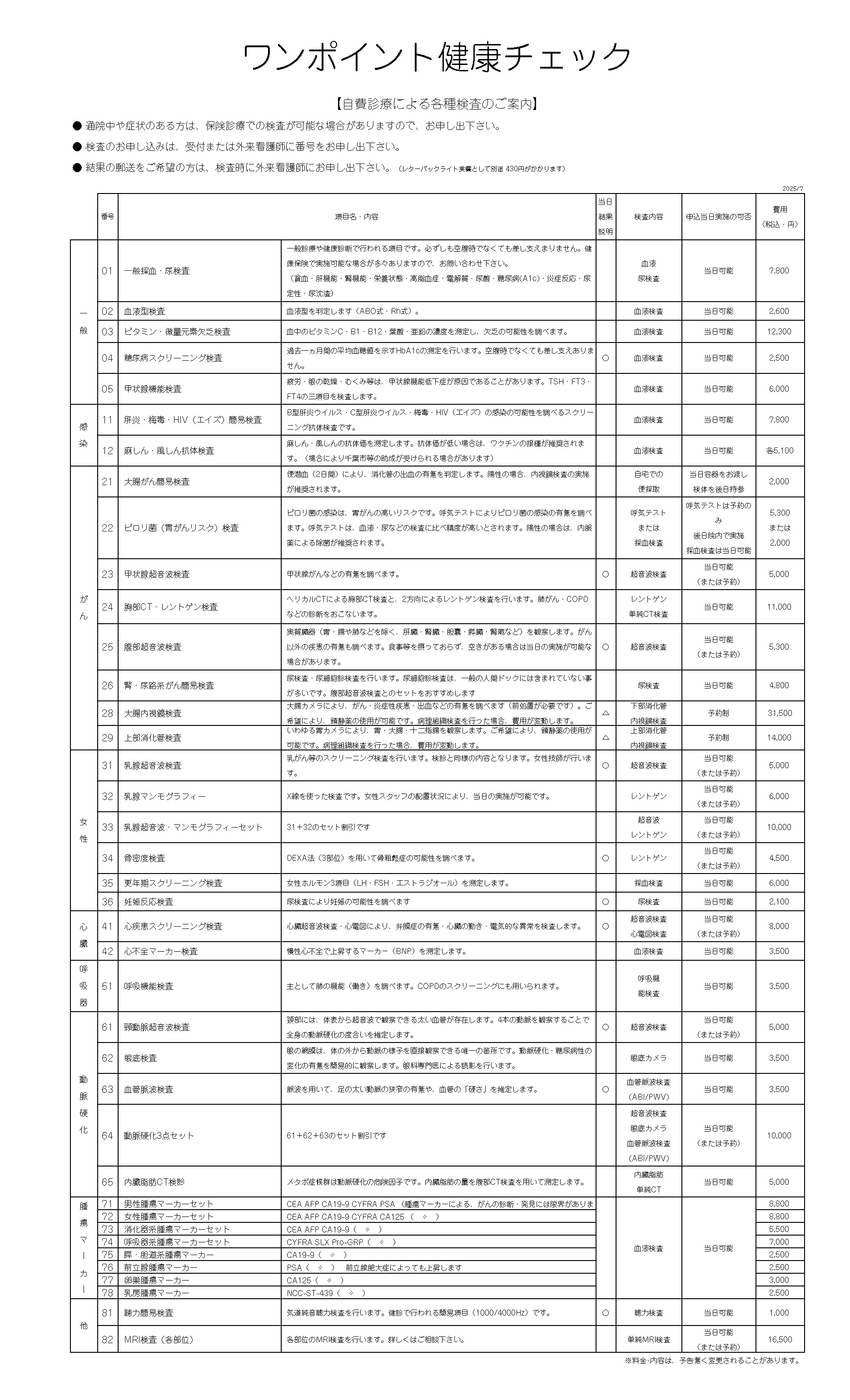 随時お受けいたします。人間ドックとの組合せも可能です。この表にない項目もお問い合わせください。